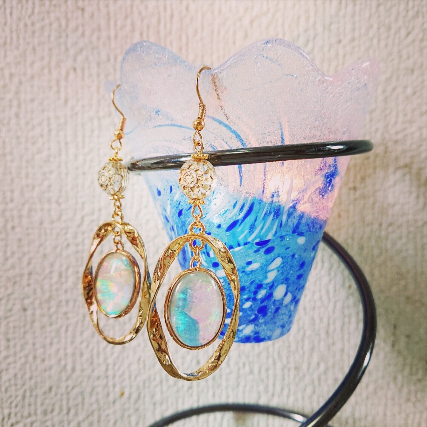 ホワイトベースのオーロラガラス使用。光りの加減で綺麗な緑やピンクのお色が見えます♪