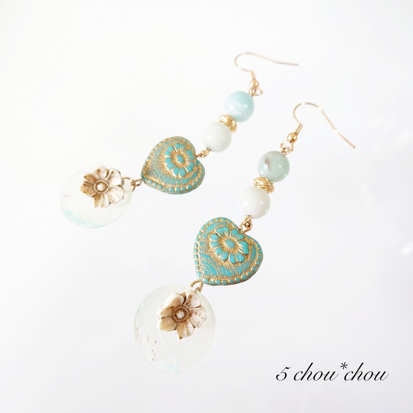 ターコイズのチェコビーズをベースに、ドイツ製パーツ、天然石アマゾンナイト、天然シェル、を使用しています♪