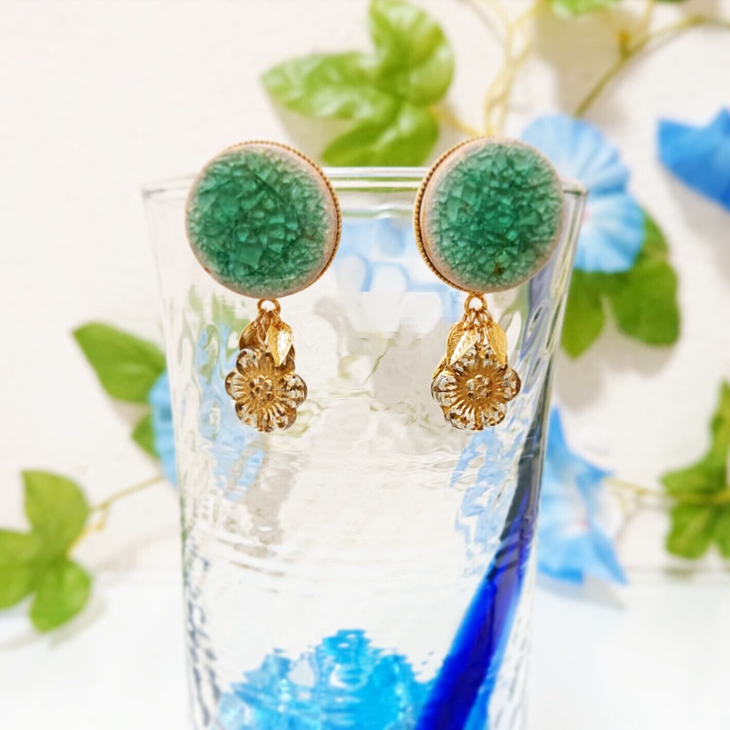 表面がクラックガラスのタイル素材をピアスパーツにしました♪