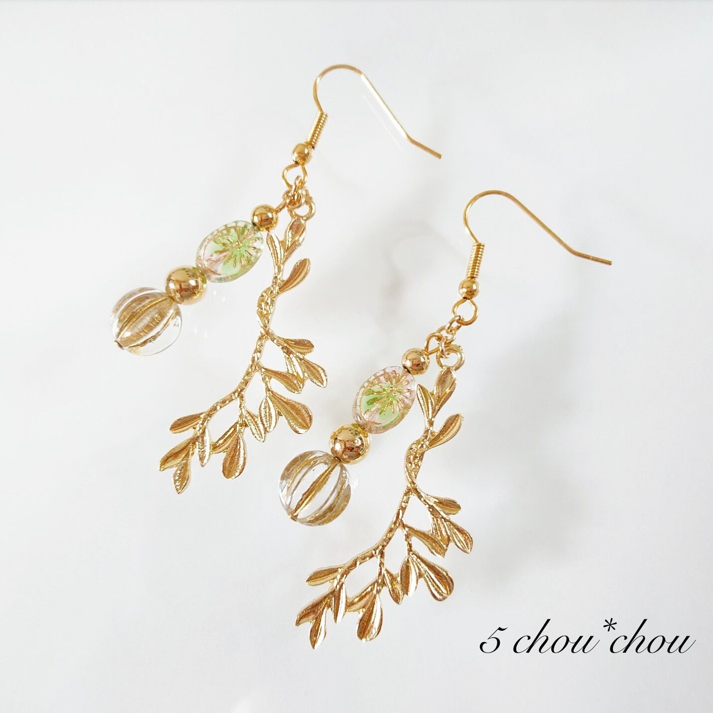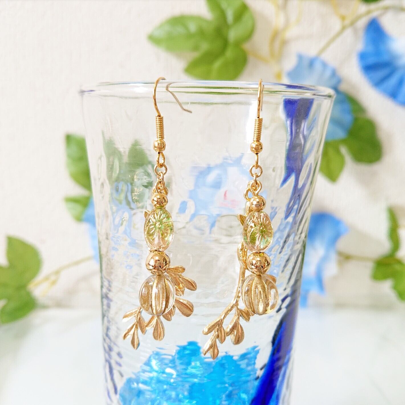 小さくスター模様の入ったミックスライムのチェコパーツ、クリスタルのメロン形ビーズに、大きめのゴールドのリーフを合わせました♪