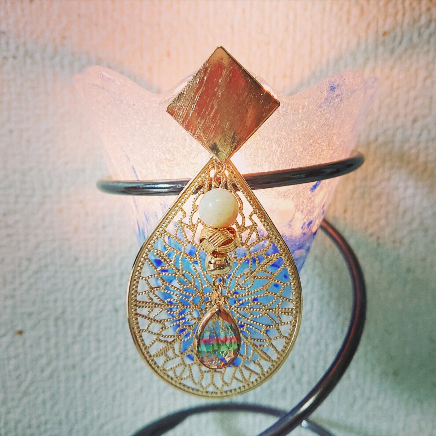 ピンク、グリーン、ブルーなどのグラデーションが入ったガラスパーツと天然石アマゾンナイト、ゴールドパーツを合わせた蝶々の羽のデザインです♪