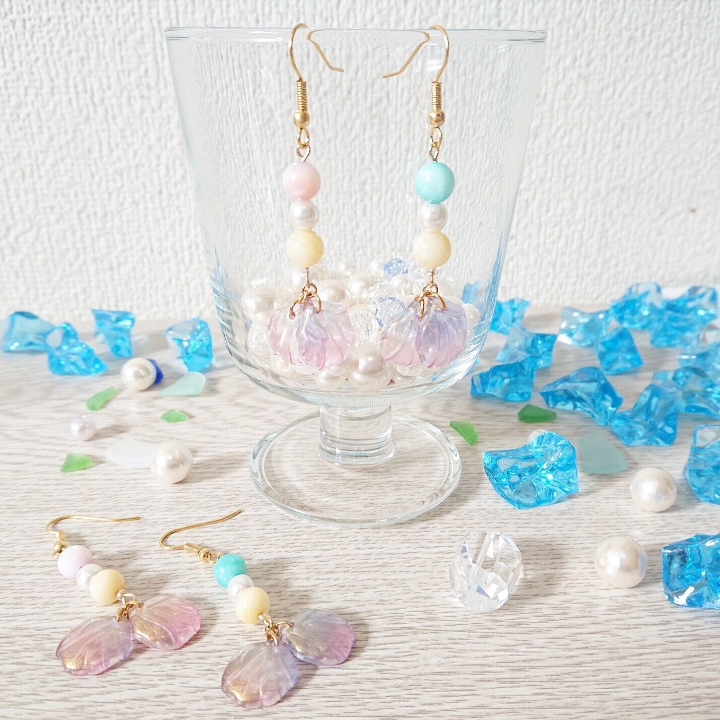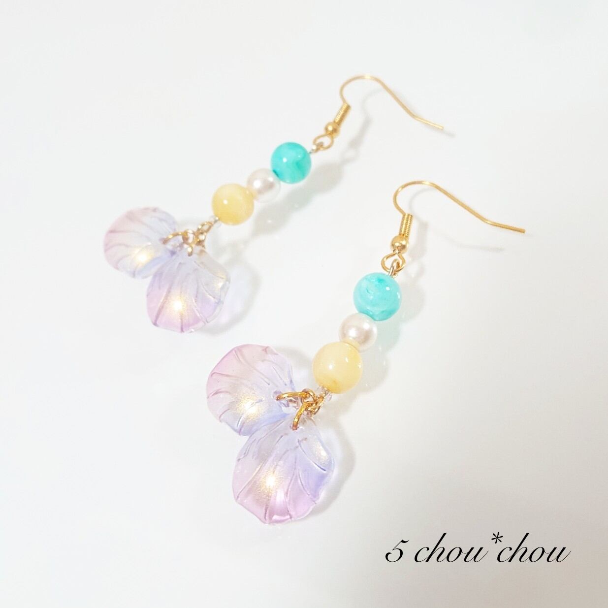 天然シェルビーズのイエローとアクアブルー、フラワーペタルガラスを使用しています♪