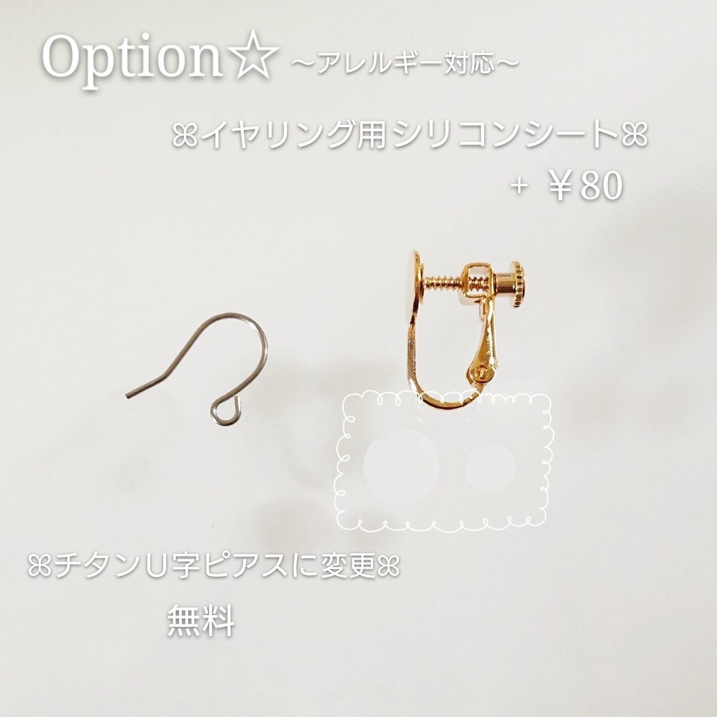 イヤリング、チタンU字ピアスに変更の場合はかなりデザインが変わってしまいますので、お写真ご確認の上ご希望下さい。