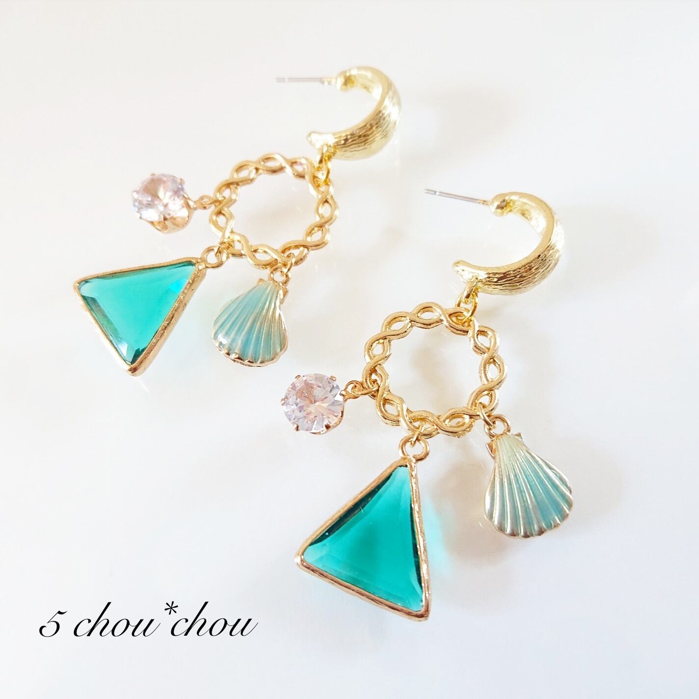 ゴールドパーツ、シーグリーンのガラスパーツ、クラウンジルコニア、シェル型チャームを使用しております♪
