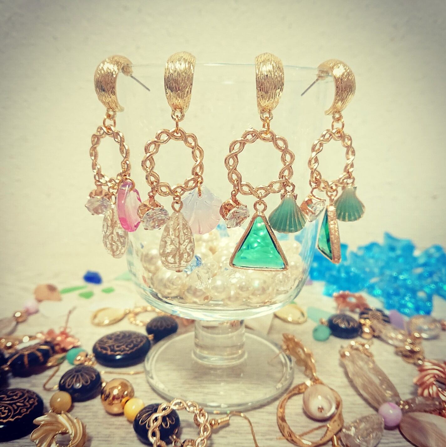 ゴールドパーツ、アンティーク調パーツ、クラウンジルコニア、フラワーペタルガラスを使用しております♪
