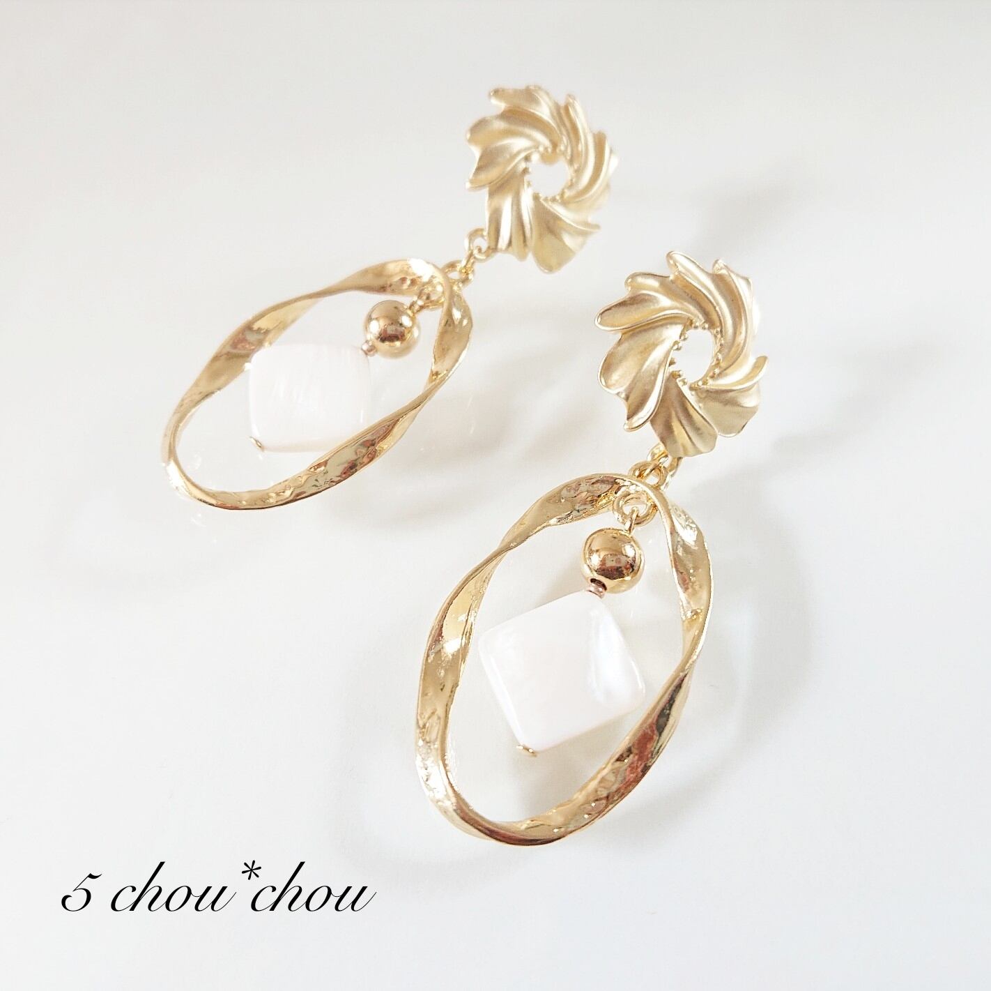 マットカラーのフラワーピアスパーツ/ゴールドに、天然シェルを使用した夏にピッタリの大ぶりピアスです♪