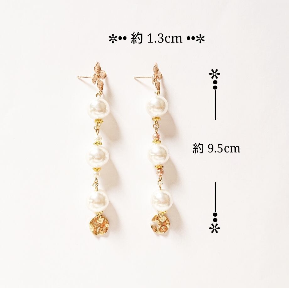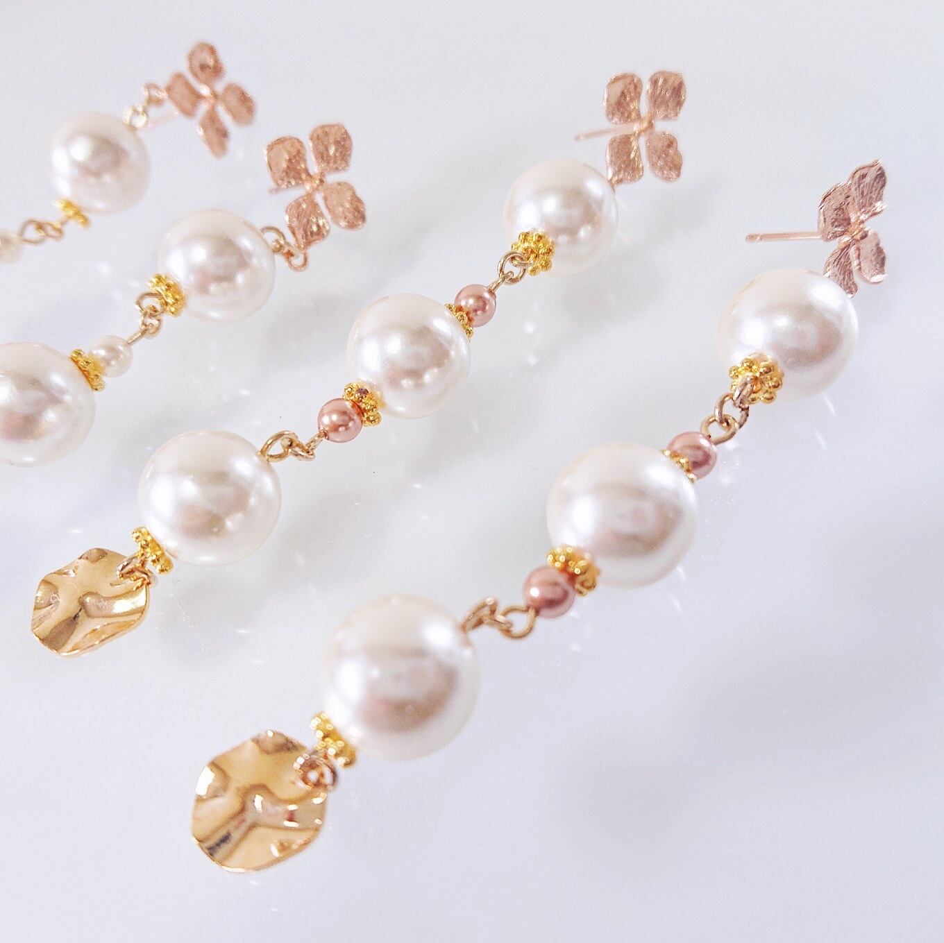 ピンクベージュのフラワーピアスに大きめのパール、スワロフスキーのパールビーズを合わせました。