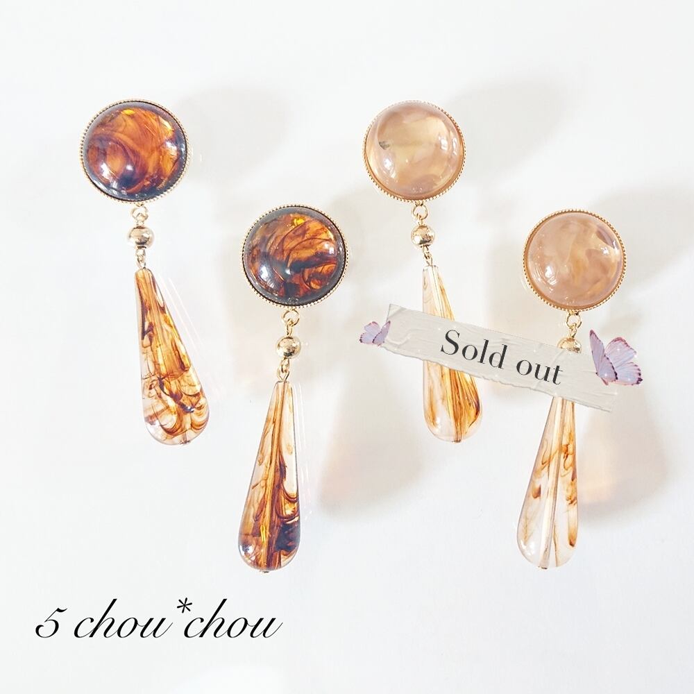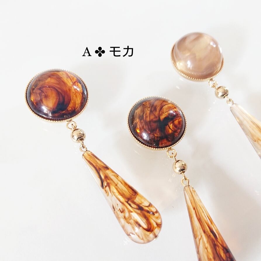 カフェオレのようなデザイン柄のアクリルカボションをゴールドの台座にのせて、ドロップパーツと合わせました。